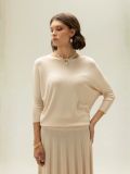 Bluză de siluetă dreaptă. Cu răscroiala gâtului în formă de bărcuță la baza gâtului, prelucrat cu bentiță, cu linia umerală alungită cu manșetă lată, mâneca fiind până la cot.