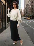 Mâneca voluminoasă mulează gingaș încheietura într-un manjet reiat și lung.
